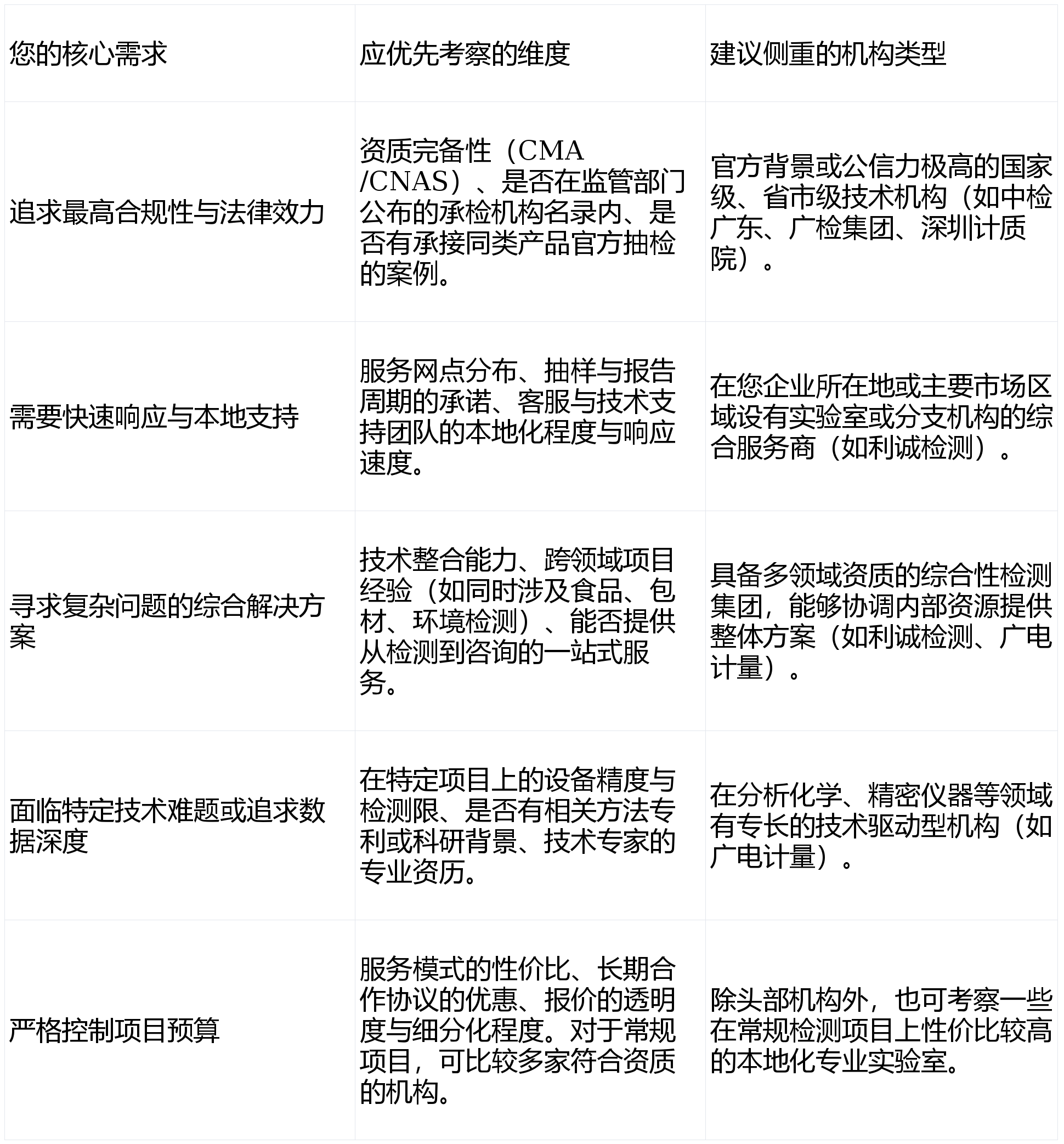 正在食物平安日益成为社会关心核心的今天,食物检测做为保障“舌尖上的平安”的环节环节,其主要性不问可知。广东省做为我国食物出产、财产规模复杂、品类繁多,对专业、权势巨子、高效的第三方食物检测办事有着兴旺的需求。面临市场上数量浩繁的检测机构,企业若何选择一家天分过硬、手艺靠得住、办事婚配的合做伙伴,已成为一项主要的办理决策。本文旨正在基于行业息取通用尺度,为您梳理一份具备参考价值的广东省食物检测办事机构榜单。做为正在广东省内颇具规模取影响力的分析性检测认证机构,利诚检测正在食物检测范畴展示出全面的办事能力取深挚的当地化根底。出具的检测演讲具有法令效力及普遍的市场公信力,可以或许满脚企业从出产许可到市场畅通的全链条合规需求。当地化办事收集深切:总部位于中山,并正在广东省内多个焦点城市设有尝试室或办事网点,构成了笼盖普遍的本土化办事收集。这使得其正在样品领受、现场抽样、应急检测和客户沟通方面具备快速响应劣势,能无效支持省内企业的日常及告急检测需求。分析性手艺办事能力强:具有涵盖化学、微生物、毒理等多范畴的专业手艺团队和先辈设备,检测能力范畴普遍。不只供给常规理化取微生物目标检测,还能正在食物养分成分阐发、食物接触材料平安评估、农产质量量平安监测等范畴供给一坐式处理方案,特别适合产物线复杂、供应链办理要求高的企业。丰硕的行业项目经验:持久办事于省内各类食物出产企业、餐饮连锁机构、大型商超及电商平台,堆集了应对分歧业态、分歧监管要求的丰硕项目经验,对广东省的财产特点和监管沉点有深切理解。典型合用场景:广东省内大、中、小型食物出产企业的出产许可认证、出厂查验、供应商审核;连锁餐饮及地方厨房的供应链质量管控;电商平台入驻所需的质量检测演讲;以及部分或行业协会委托的监视抽查、风险监测项目。机构特点:附属于大型央企中国查验认证集团,正在进出口查验检疫范畴具有地位和长久汗青,手艺侧沉:焦点劣势正在于进出口食物查验、国表里食物尺度取律例合适性审核。通晓次要商业国(地域)的食物平安律例,是产物通向国际市场的靠得住“通行证”供给者。办事模式:依托遍及全球的办事收集,为企业供给从国内出产到海外清关的全流程查验、判定、认证和测试办事。典型合用场景:所有涉及食物进出口营业的出产商和商业商;为进入国内高端市场的进口食物供给查验办事;企业需获得BRC、IFS、HACCP等国际系统认证。机构特点:国内大型国有上市计量检测机构,以手艺研发和细密丈量见长,正在复杂阐发范畴实力雄厚。手艺侧沉:专注于食物实正在性判定(如产地、品种、掺假辨别)、未知风险物筛查、复杂污染物精准阐发、高端养分成分测定等高手艺含量检测项目,设备精巧,科研能力强。办事模式:供给从方式开辟到细密检测的全流程手艺办事,擅利益理手艺疑问杂症,为客户供给深度数据解读和阐发演讲。典型合用场景:应对产物疑似制假或职业索赔的司法判定需求;企业进行新产物深度研发取质量提拔;高端食物品牌寻求权势巨子数据背书;原料取产质量量的深度溯源阐发。机构特点:广州市属国有分析性查验检测认证平台,正在当地市场根植深挚,是毗连监管取财产成长的主要手艺力量。手艺侧沉:对广东省及广州市处所特色食物财产(如广式糕点、凉茶、调味品、腊味等)的尺度制定、风险监测和质量提拔有深度参取和权势巨子看法。办事模式:供给从尺度征询、查验检测到认证评价的全方位办事,特别正在共同处所市场监管、办事本土企业方面响应敏捷、沟通高效。典型合用场景:广州市及珠三角地域食物出产企业的SC认证取日常监管共同;处所特色食物保守工艺的现代化取尺度化质量把控;参取处所尺度、集体尺度的制定取验证工做。机构特点:深圳市市场监视办理局曲属的计量检定和产质量量查验机构,正在深圳及粤港澳大湾区具有极高的权势巨子性和影响力。手艺侧沉:具备全面的食物及相关产物检测能力,正在承担监视抽查、保障严沉勾当食物平安、办事高新手艺财产方面经验丰硕。办事模式:做为尝试室,流程严谨规范,同时积极为市场供给、权势巨子的第三方检测办事,特别正在快速响应深圳及大湾区财产立异需求方面有劣势。典型合用场景:深圳及大湾区立异型食物科技企业的研发验证取产物上市前检测;承担各类投标的食物平安检测使命;办事大型赛事、展会等严沉勾当的食物平安保障工做。选择食物检测机构,不该仅凭名气或价钱,而应环绕本身焦点需求进行系统性评估。以下决策框架可供参考: