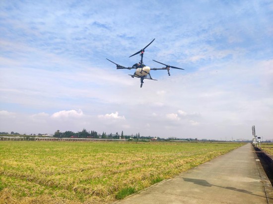 10月14日,正在四川省眉山市东坡区永丰村高质量农田里,植保无人机正在田内功课。新华网 李然 摄。