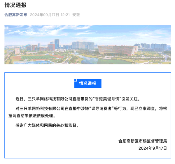 巧合的是,当地有一家老字号月饼品牌,它的名字则是叫美心月饼,这就让不少网友感觉,美诚月饼压根就是个冒充伪劣的盗窟产物。可就当大师认为这闹剧会像隔邻的交个伴侣,由于曲播间售卖的芬迪卡萨月饼涉嫌制假,给大师退一赔三。成果,三只羊选择了头铁硬扛拒不退货,以至月饼厂商还冤枉上了,辩驳说:谁的工具不克不及正在内地出产的。由于美诚月饼这个品牌商标,就是美诚食物集团注册,然后授权给广州美诚食物公司用的,还实能够算是品牌。所以,再客概念说,美诚月饼厂商前面冤枉地说,“谁的工具不克不及正在内地出产的”“本人不是小做坊的”,也还实没啥弊端。于是,广州市花都区市监局也正在布告暗示,本人曾经发函,要求合肥市监部分协帮查询拜访了,把问题抛给了合肥市监局。