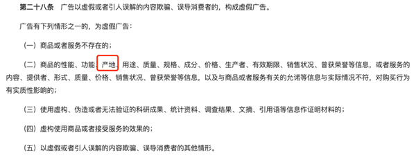 而按照告白法第二十八条,也确实提到了产地消息取现实环境不符,对采办行为有本色影响,也能算做虚假告白。