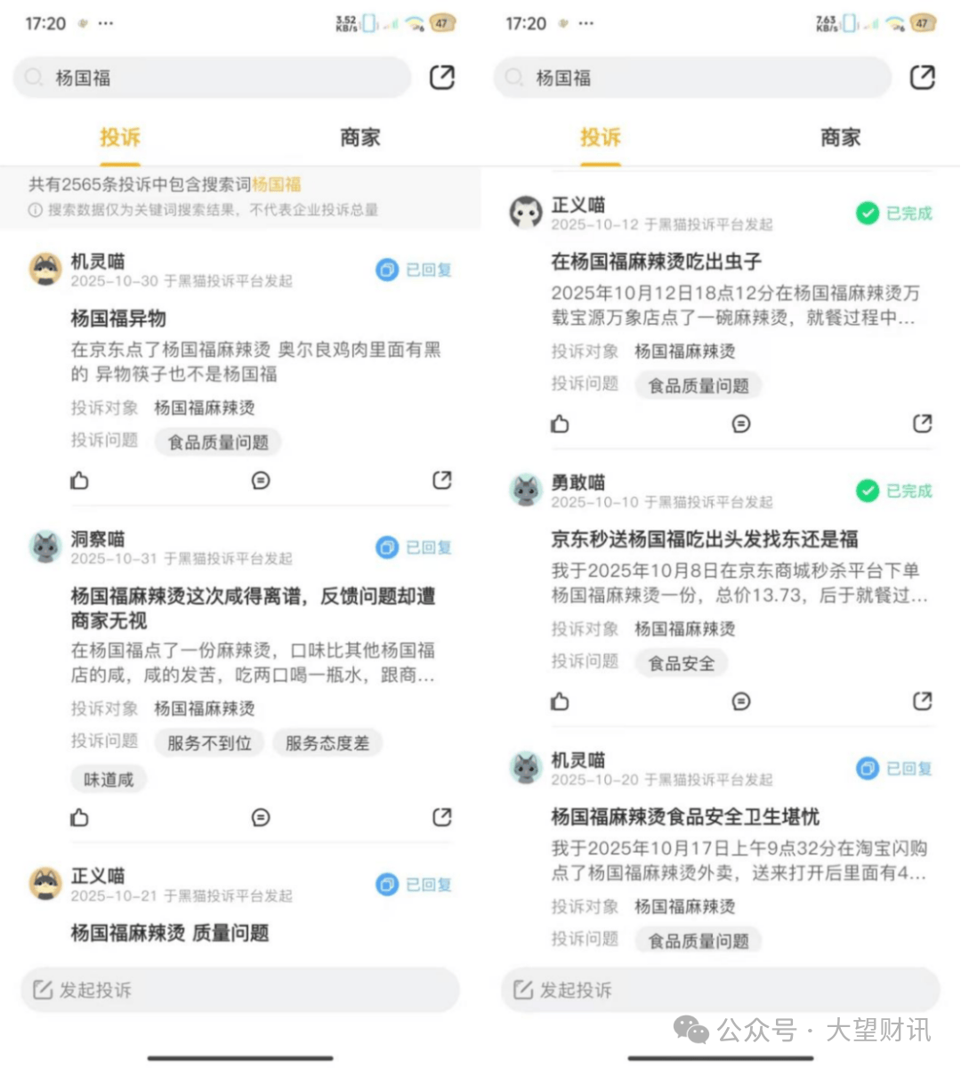 大望财讯查询黑猫赞扬平台显示,截至2025年11月18日,关于杨国福集团的赞扬高达2565条,赞扬内容集中正在食物质量问题、吃到异物等环节。