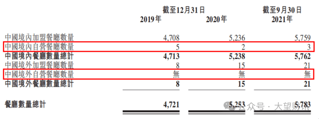 按照2021年的公开招股书数据,截至昔时9月30日,杨国福集团旗下全球餐厅共计5783家,包含位于上海的3家自营餐厅,5759家正在中国的加盟餐厅,及结构正在、、韩国、日本和新加坡的21家海外加盟餐厅,加盟店占比高达99。9%,形成其业绩的绝对支柱。
