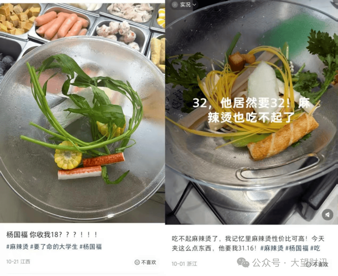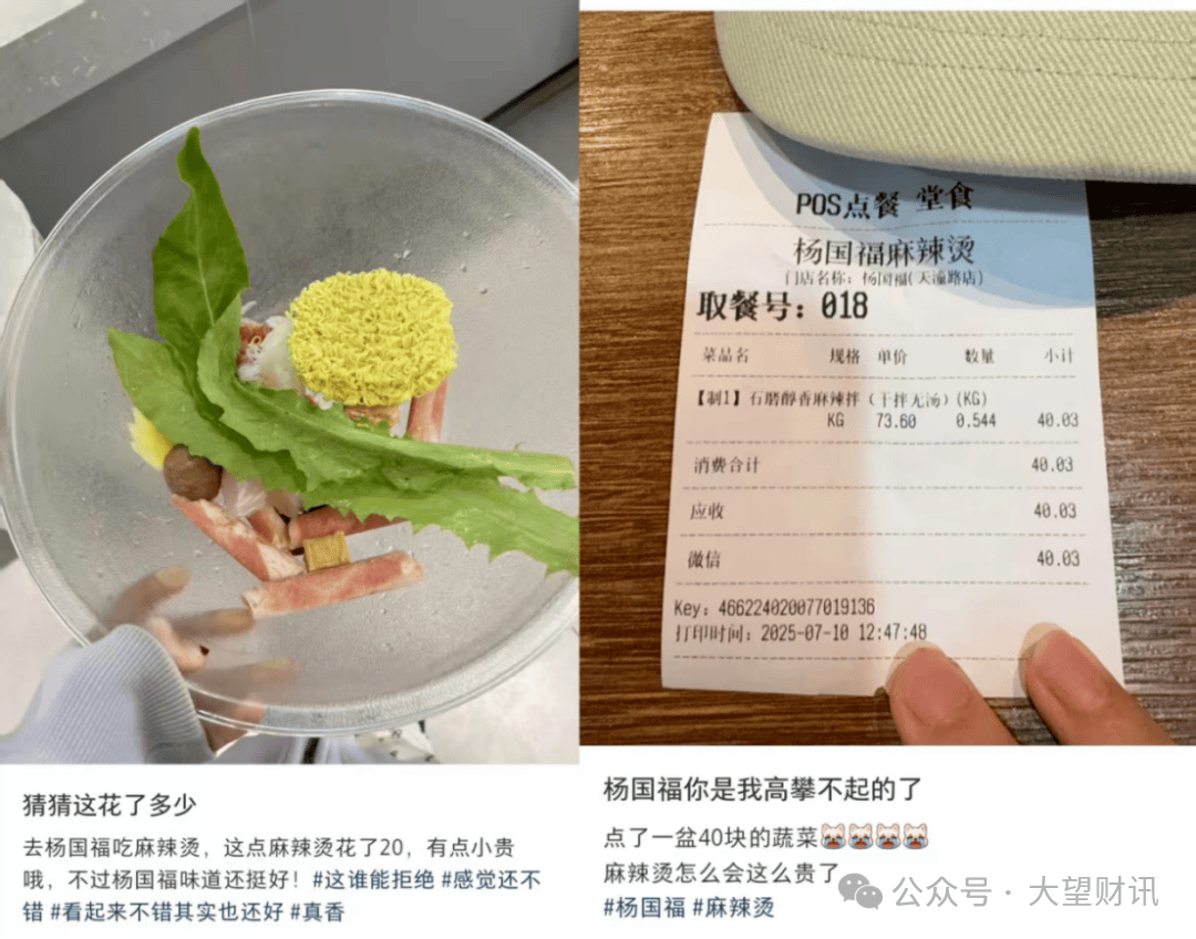 有网友晒出点餐单据,显示一份干拌麻辣烫实付金额达40。03元,并配文称“杨国福你是我高攀不起的了。”,暗示“点了一盆40块的蔬菜。”?。