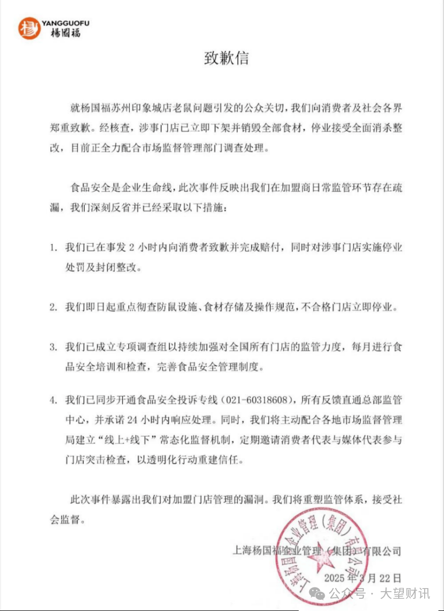 早正在本年3月,有网友反映姑苏印象城店内杨国福麻辣烫店食物柜呈现一老鼠。对此杨国福集团发传教歉信暗示,已正在事发2小时内向消费者道歉并完成赔付,同时对涉事门店实施破产惩罚及封锁整改;本日起沉点彻查防鼠设备、食材存储及操做规范,不及格门店当即破产。