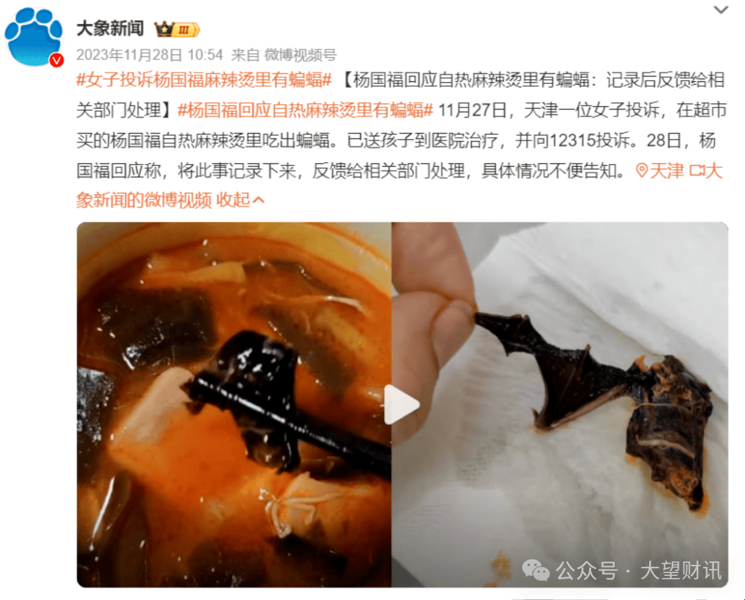 2023年11月,天津一女子赞扬,她正在超市买的杨国福自热麻辣烫里吃出了蝙蝠。杨国福集团对此回应称,将此事记实下来,反馈给相关部分处置,具体环境未便奉告。